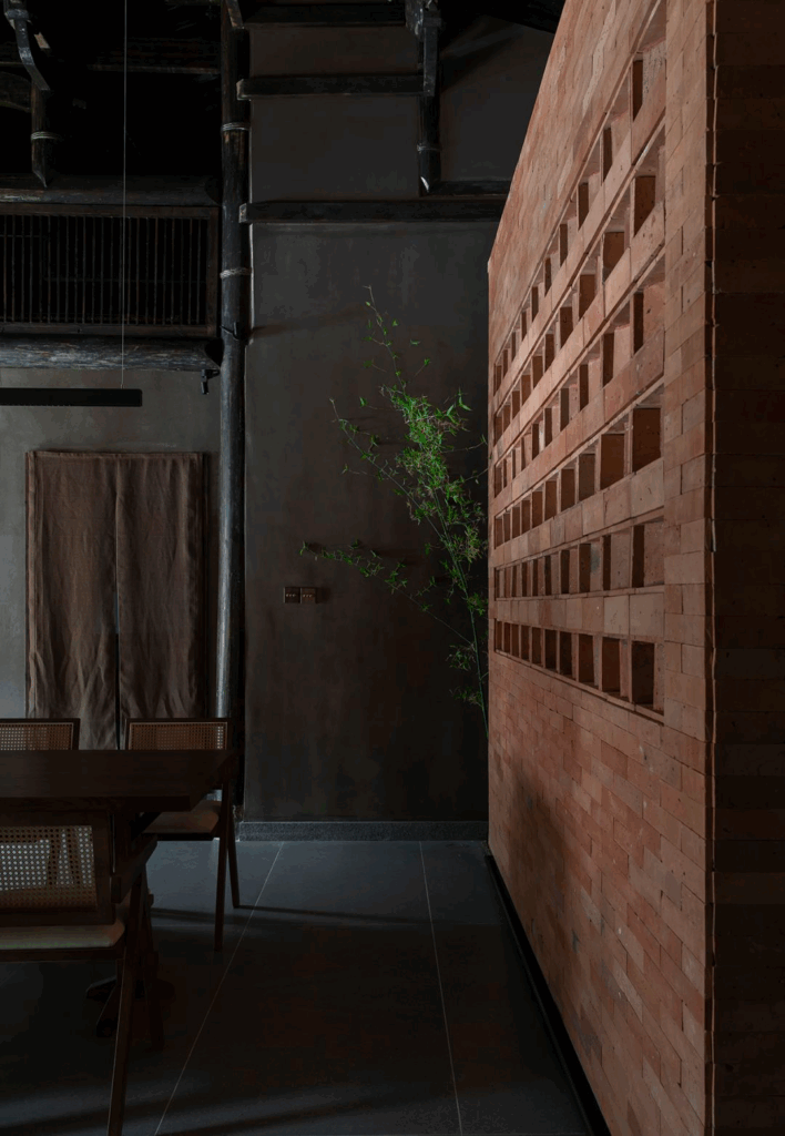 前身為 50 年老米店。設計保留原始紅磚與水泥柱,吧檯則以再生紙漿板手工壓製。茶師沖泡鐵觀音時,蒸氣與牆面青苔香氣交織——整個空間像是一杯茶,溫潤,帶著餘韻。