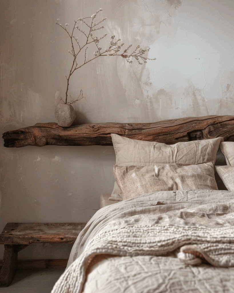 屋主以親手拾回的漂流木製成層板,安放自製陶杯與鹿角蕨。餐桌為回收柚木,刻意保留鋸痕與原生節點。牆面則以灰泥(lime plaster)自然抹紋處理,旅客常說:「像是走進一本靜止的時間書籤。」
